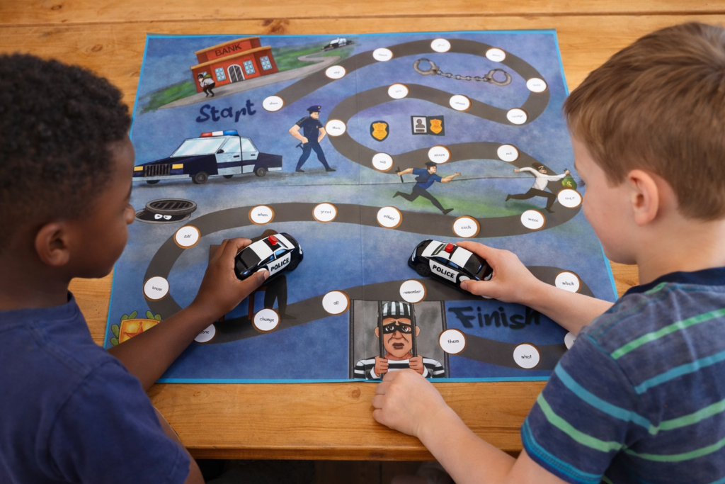 Low-Stress Repetition: Our board games introduce a high volume of repetition in a novel, engaging context. Instead of staring at a flashcard, a child lands on the same “tricky word” multiple times throughout the game.