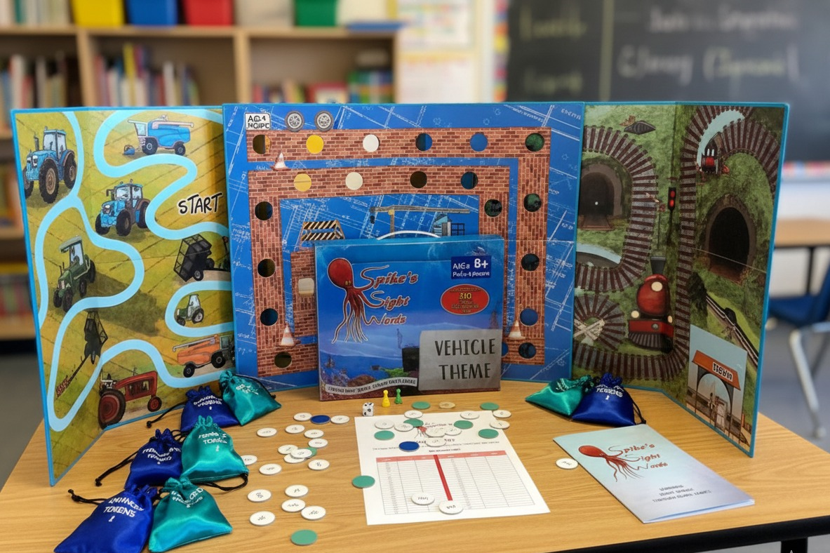 Start with the Tractor board to build a steady reading rhythm. Encourage your child to say each word aloud as they “plough” through the tokens. Moreover, this active play helps them remember tricky spellings. Once they gain speed, move to the Construction board for a bigger challenge! Because our system is modular, you can mix the tokens across all three boards. Resultantly, your learner will soon master over 150 high-frequency words.